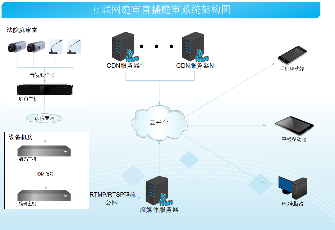 華威庭審直播雲服務平台緊密結合法院音(yīn)視(shì)頻(pín)業(yè)務需求,為(wèi)法院提供完整高(gāo)效、易于構建、開∑(kāi)發的(de)雲計(jì)算(suàn)互聯網庭審直播平台。基于法院庭審業(yè)務的(de)需求、視(shì)頻(pín)存儲ε、轉碼、分(fēn)發、管理(lǐ)、流媒體(tǐ)播放(fàng)器(qì)于一(yī)體(tǐ)的(de)雲視(shì)頻(pín)服務平台。用→(yòng)戶隻需提供庭審視(shì)頻(pín)信号源、案件(jiàn)數(shù)據信息,即可(kě)實現(xiàn)庭審互聯網直播功能(néng)。華✔威擁有(yǒu)完善的(de)線下(xià)服務網絡系統,支持現(xiàn)場(chǎng)、遠(yuǎn)程庭審監控、後期錄像剪輯、設備巡檢、日(rì)常維護等服務。