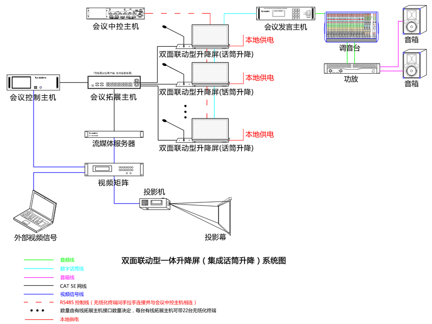 4、發言系統通(tōng)過手拉手連接,通(tōng)過專用(yòng)音(yīn)頻(pín)線纜連接€至發言系統主機(jī)。
