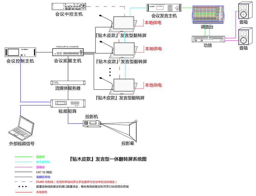 1、系統拓撲結構簡單,所有(yǒu)桌牌顯示、同步數(shù)據、文(wén)稿、視(shì)頻(pín)統一(yī)走局域網,實現(xiàn)了(le)純數(shù)字純網線的(de£)組網連接,極大(dà)降低(dī)了(le)施工(gōng)複雜(zá)度,提高(gāo)了(le)系統穩定性和(hé)可(kě)維護性。
